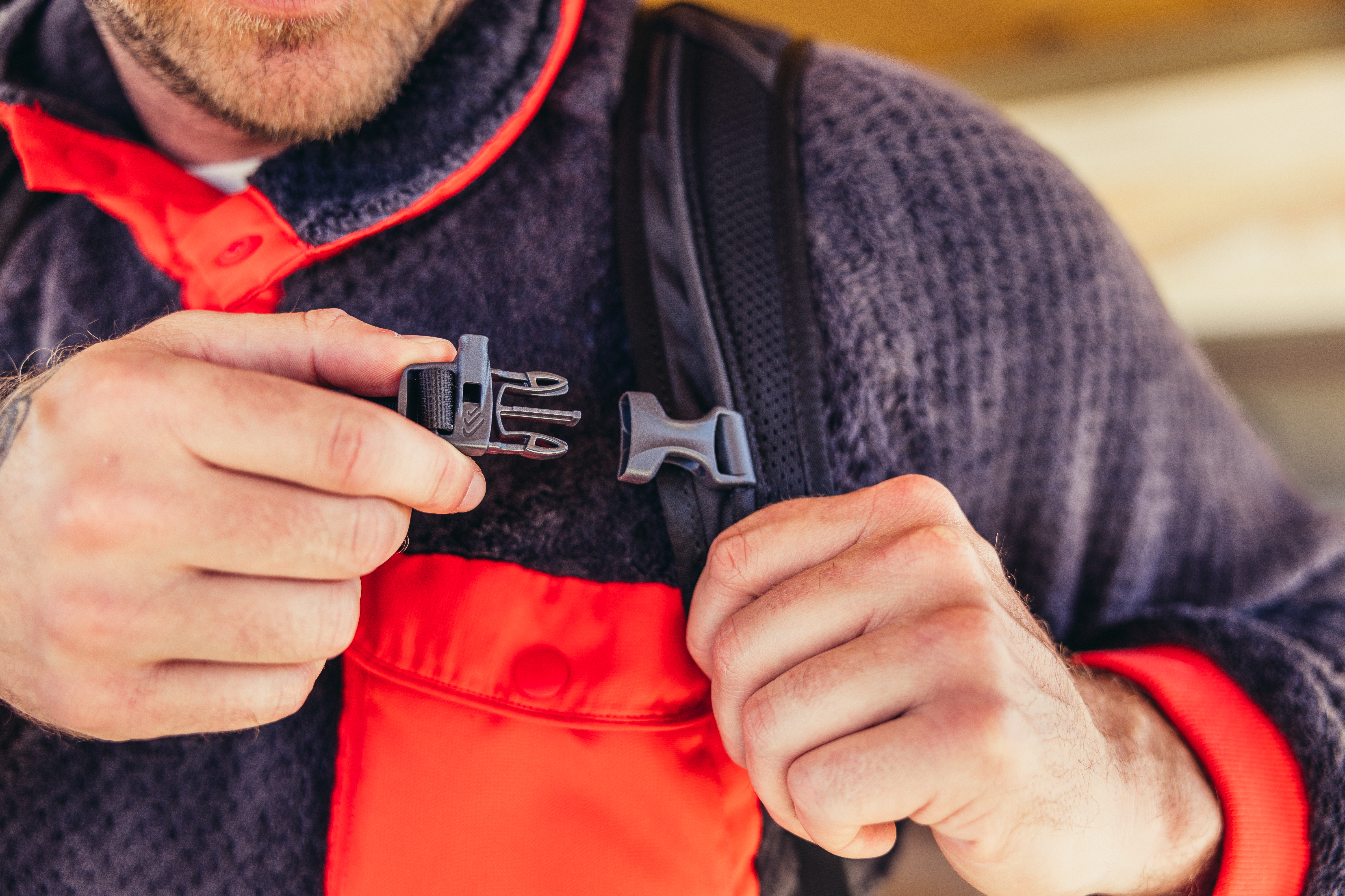 • Padded airmesh shoulder harnesses with one-handed sternum strap buckle and hydration routing loops