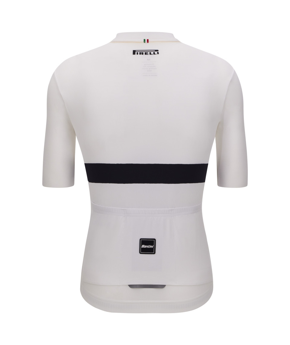 The triple back pocket makes this jersey ideal for longer rides and bike commuting. Certified UPF50+, the Pirelli SC jersey offers maximum protection against harmful UV rays, during long days spent under the sun. Gray reflective detail on the back of the jersey. Both Pirelli SC and Santini logos are applied as matte black silicone transfers. Inside the jersey, a label is sewn that tells the story of the Pirelli Sport Club.