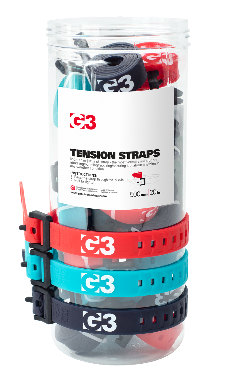 Super tough and flexible, even at cold temperatures, G3 Tension Straps are for more than just holding skis together. More versatile and reliable than zip ties or duct tape, it’s a good idea to always have a couple in your pack. Shorter sizes are great for skis and other gear. Longer sizes are useful for lashing bulky items to your pack, roof rack or bicycle.