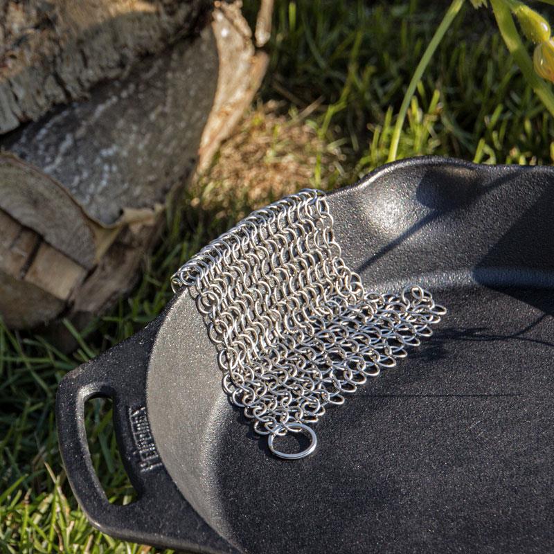 Let the cookware cool down, possibly let it briefly soak, and scrub off the burnt residues with warm water and the chain mail cleaner. You do not need any dish detergent. Rinse the cookware again thoroughly after cleaning. Before putting your cast- or wrought-iron cookware back into the cupboard, always dry it well and treat it as usual. The chain mail cleaner shall also dry thoroughly after use, otherwise contact corrosion is possible (Caution!).