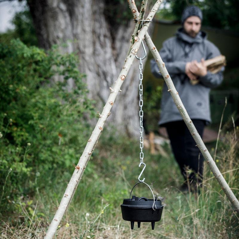 The Tripod Lashing can be part of any luggage, as with an overall weight of 450 g you can easily stow the disc as well as both hooks and chain to be taken along on your exploration tours. In the natural surroundings of your camp you find the necessary branches and thus remain completely independent outdoors. In addition, after having satisfied your hunger, you can also use the Tripod Lashing to build a stable shelter or tipi for the night on firm ground.