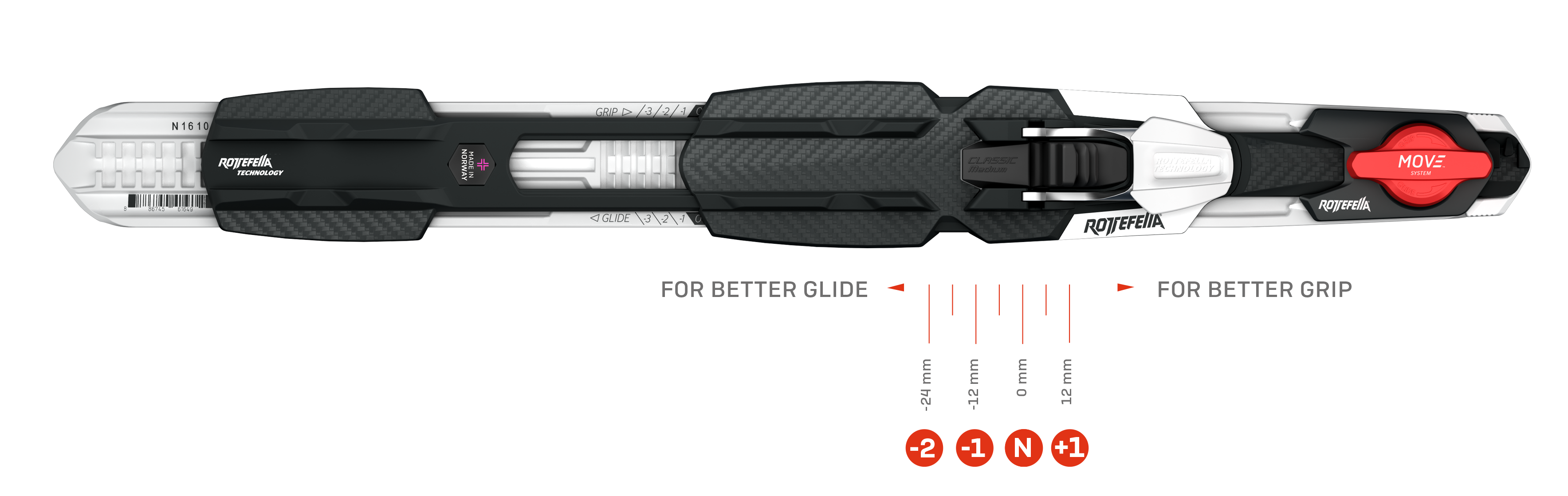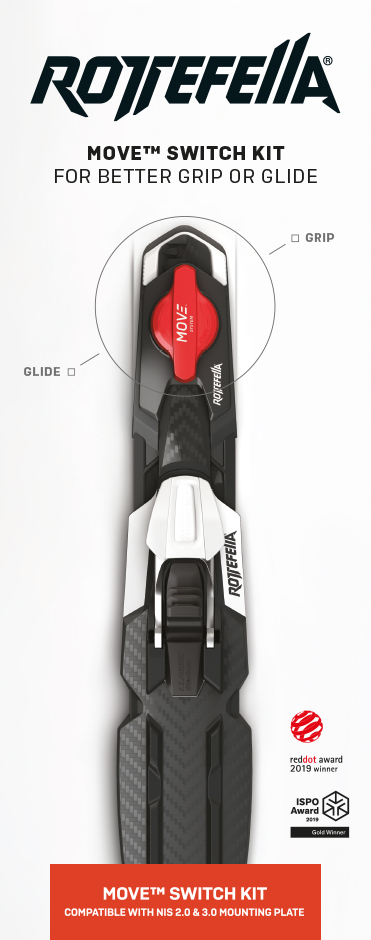 Upgrade to Rottefella Move system which provides you with maximum glide when seconds count. Simply lift, push and lock the lever and the binding is moved 30 mm backwards with one simple movement. Perfect for wax skis. Rottefella MOVE™ Race is approved by FIS and can be used in all competitions. Rottefella MOVE Race Kit for NIS 3.0 fits all skis with NIS 3.0 mounting plate.