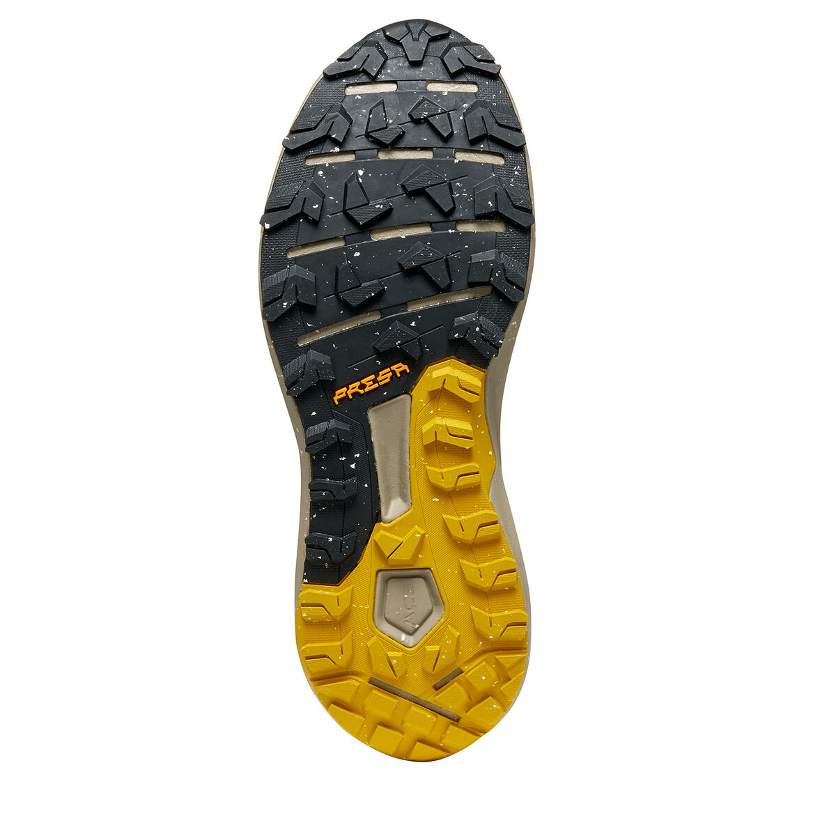 Comfort and sustainable performanceare the factors behind the design of PRESA® TRN-06, which is characterized by the high content of waste material reused inside, as the rubber outsole is 30% recycled.Wide, not-too-thick lugs and the holeson the rubber, allow for easy flexion and adaptability, making the sole perfect for running for a long time on medium difficulty routes, maintaining a fast pace and rolling on any surface.