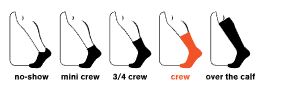 Crew socks will come to mid calf on most users. They’re great in activities where you may need more warmth or coverage on your leg.
